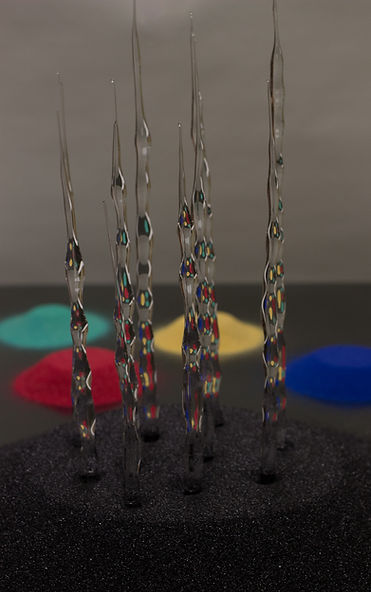 Glass and sand pedestal installation using clear borosilicate glass and black slag, reflecting the colored sand in the background.